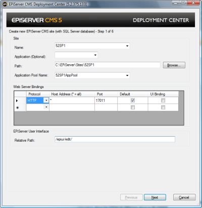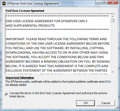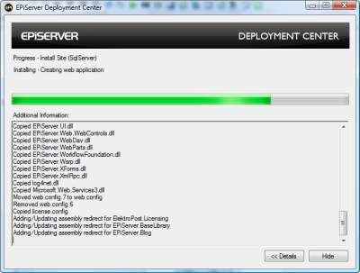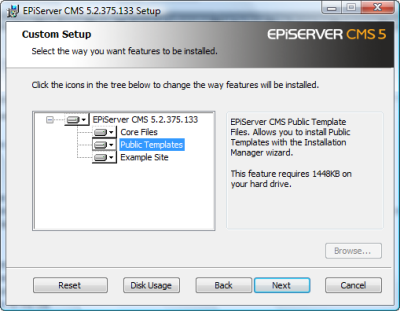 Installing EPiServer CMS is built on Windows Installer to support installation, uninstallation, component upgrade as well as component and installation integrity. Windows Installer has built in support for User Account Control and requests user elevation when necessary (Vista and WS 2008). We use windows installer technology for deploying files, updating registry and checking prerequisites. As a final step depending on user input during the installation wizard the windows installer can call into EPiServer Deployment Center (see below) for performing site creation and deletion (during uninstall).