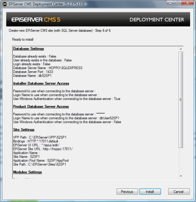 The EPiServer CMS 5 R2 SP2 installation comprises of EPiServer CMS 5 R2 SP2 assemblies and various components for installation of Web sites. The Express Installation is a "one click installation" scenario - making it very quick and easy to install a first version of EPiServer CMS.