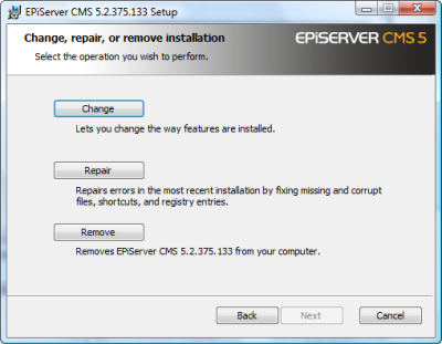 If you wish to change, repair or remove the EPiServer CMS 5 R2 SP2 installation then click on the Setup.exe file and then Next. The Dialog below will then appear. Click on the appropriate button.