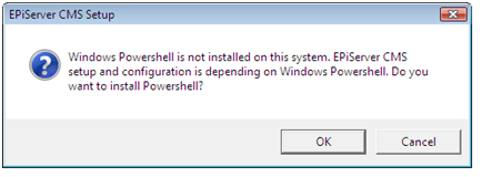 If during EPiServer CMS installation Microsoft Windows Powershell is not found on the target machine then the EPiServer CMS installer will install it as part of the installation process. EPiServer Shared Components will be installed as well as database and Web site creation - if opted for. When performing a first installation the followling steps should be carried out:
