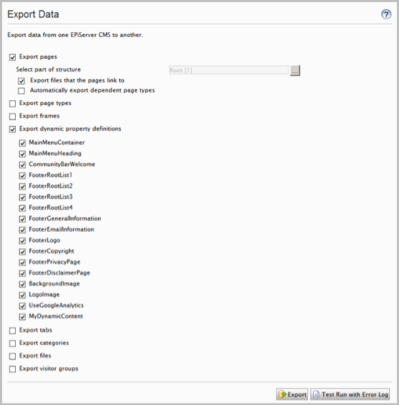 To get content from Composer we will need to create an export package containing the main content, including pages and dynamic properties. Include all pages by selecting the root page as the part of the structure you want to export. If you want your files migrated as well, keep the "Export files..." option selected.