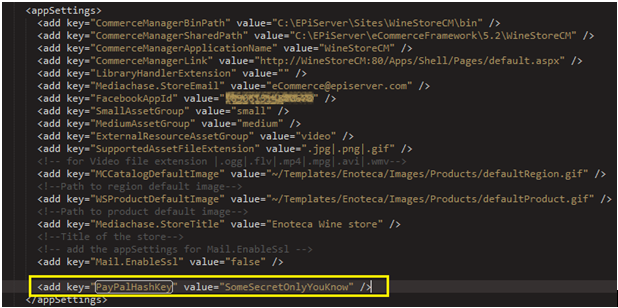 You can configure this hash key in the application settings configuration section under the key “PayPalHashKey”.
