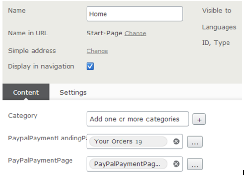 - Edit the PayPalPaymentPage property on the Home page and set the page link of the created page (in the second step) to the property's value.