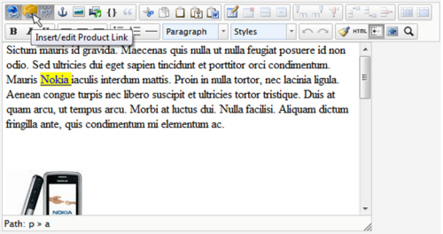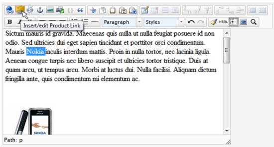 This plug-in creates a tool button in the toolbar in the EPiServer CMS 6 (TinyMCE) Editor. This makes it possible for editors to link to selected products from the product catalog in Commerce Manager. When the link is clicked on, the visitor will be transferred to the product page "view mode" for that product.