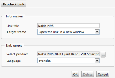 Enter the details for the link such as title and target fram, just as you would for any link in EPiServer CMS. Refer to the EPiServer CMS user documentation for detailed expalanation of the fields. Click OK.