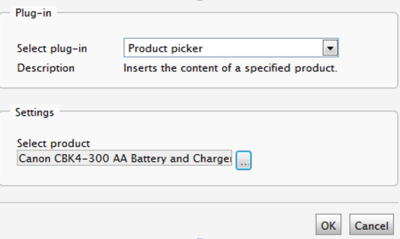 In the Plug-in field, select Product picker from the drop-down list. In the Settings field, you can select a product from the Commerce Manager product catalog.