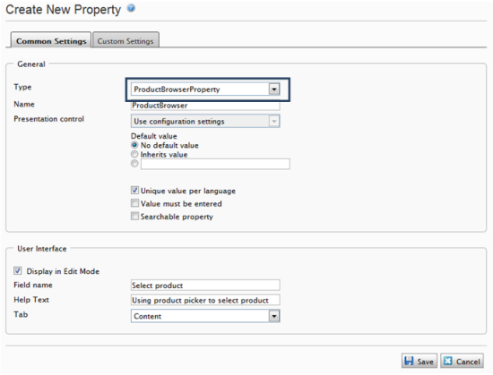 Under the Common Settings tab, set Type as ProductBrowserProperty and Name as ProductBrowser. The other fields can be set as desired (please refer to the EPiServer CMS user documentation for more details). Click Save.