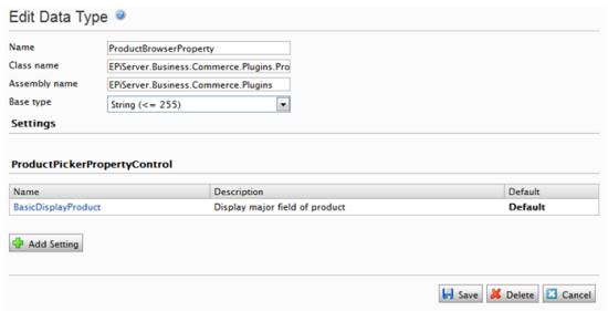Click Edit Custom Property Types under the Page Type tab, select ProductBrowserProperty then click Add Setting.