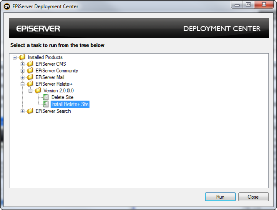 - Open the EPiServer Deployment Center from the program menu. To install a Relate + example website, choose the option Install Relate+ Site under EPiServer Relate+/Version 2.0.0.0, and click Run to start the installation.