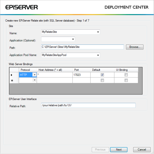 - EPiServer User Interface - Relative Path - the path used to access the user interface. Enter a path that, when combined with any of the site bindings, will access the UI interface. Note that the default value will not be accepted, you have to enter your own value.