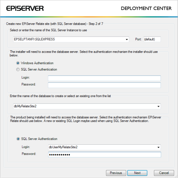 - Select the authentication mechanism the installer should use - the credentials the installer should use to perform database operations. The Windows Authentication option (default) will use the credentials of the user running EPiServer Deployment Center. The SQL Server Authentication option is used when SQL Server is located on a different machine. Selecting this option you can specify a login and password to be used.