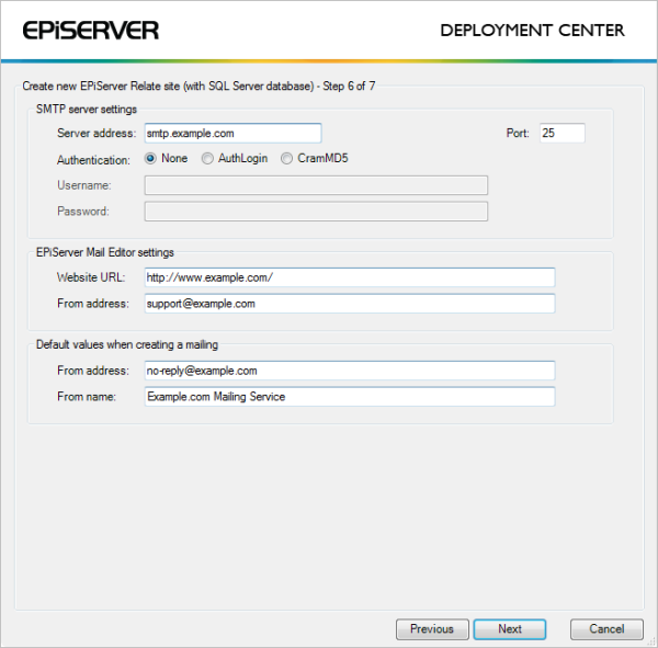 Server Address: Enter the name of the SMTP Server instance to use and the Port number. This is the mail server from where the e-mail messages will be sent - if it is the same server as where the EPiServer CMS website resides, entering localhost should be sufficient.