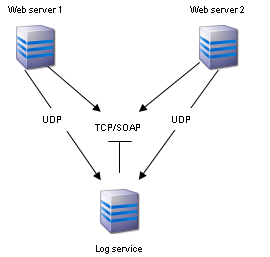 Only one log service is configured for all Web servers on a Web farm. For the sample analyzers, each Web server sends log messages to the log service over UDP and the log service publishes its results on a TCP/SOAP Web service that can be connected for all Web servers.