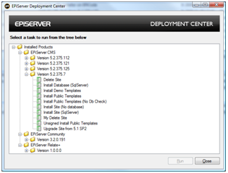 The EPiServer Deployment Center is the user interface of the EPiServer Installation and Deployment System (the original version shipped with EPiServer CMS 5.2 was known as EPiServer Installation Manager). It is used to browse and execute the actions that are available for the products installed. Examples of such actions are: Creating EPiServer (CMS/Community/Relate+) Web sites, removing EPiServer Web sites, installing modules onto EPiServer Web sites etc.