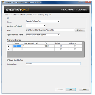 The UI Wizards are shown by the PowerShell scripts in order to collect input information for the task from the user. The EPiServer Deployment API contains a base class for wizards, EPiServer.Install.UI.WizardBase. The base class provides the entire wizard infrastructure (modal dialog, next, back, cancel functionality etc) so all the derived class needs to define is the pages to be shown in the wizard. Each page is actually an instance of a class derived from System.Windows.Forms.UserContol. The EPiServer Deployment API contains many pre-defined ‘pages’ for typical scenarios (Web site creation, database creation, folder creation etc).