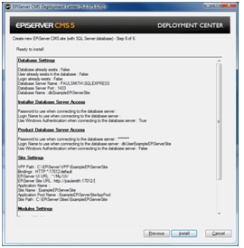 Most tasks listed in the Deployment Center have an associated user interface wizard. A wizard is one or more pages where information needed to perform the task is collected from the user. Most wizards show a summary page before execution as final confirmation about what is going to happen. Figures 2 and 3 show examples of wizard pages from the EPiServer CMS Install Site (SqlServer) Wizard.