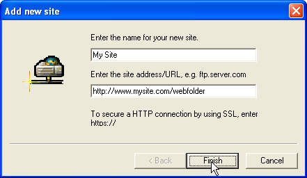 2 - Enter a name for the site (any name will do) and the URL to your site followed by the name of the designated WebDAV folder, as shown above. Click Finish.