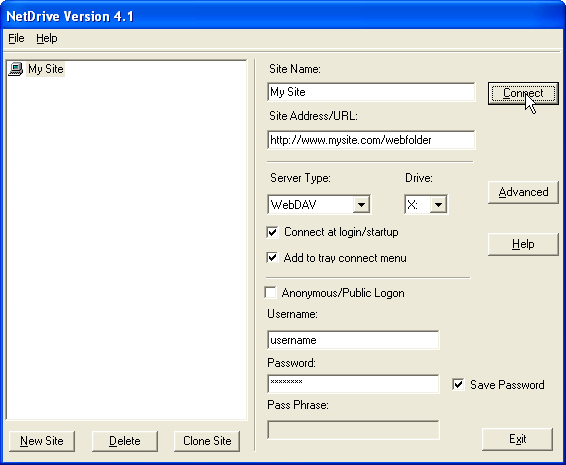 1 - Launch NetDrive from the Start menu and click the New Site button in the lower left corner. You will see the following: