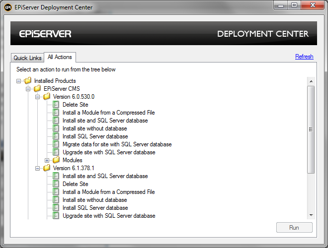 All installed EPiServer products that support EPiServer Deployment Center are shown in the tree under All Actions. Under each product node there is a version node for each version of the product installed. The tasks that can be performed for/on the product version are listed under the product version node.