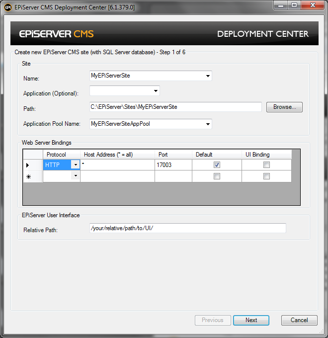 The UI Wizards are shown by the PowerShell scripts in order to collect input information for the task from the user. The EPiServer Deployment API contains a base class for wizards, EPiServer.Install.UI.WizardBase. The base class provides the entire wizard infrastructure (modal dialog, next, back, cancel functionality etc) so all the derived class needs to define is the pages to be shown in the wizard. Each page is actually an instance of a class derived from System.Windows.Forms.UserContol. The EPiServer Deployment API contains many pre-defined ‘pages’ for typical scenarios (website creation, database creation, folder creation etc).
