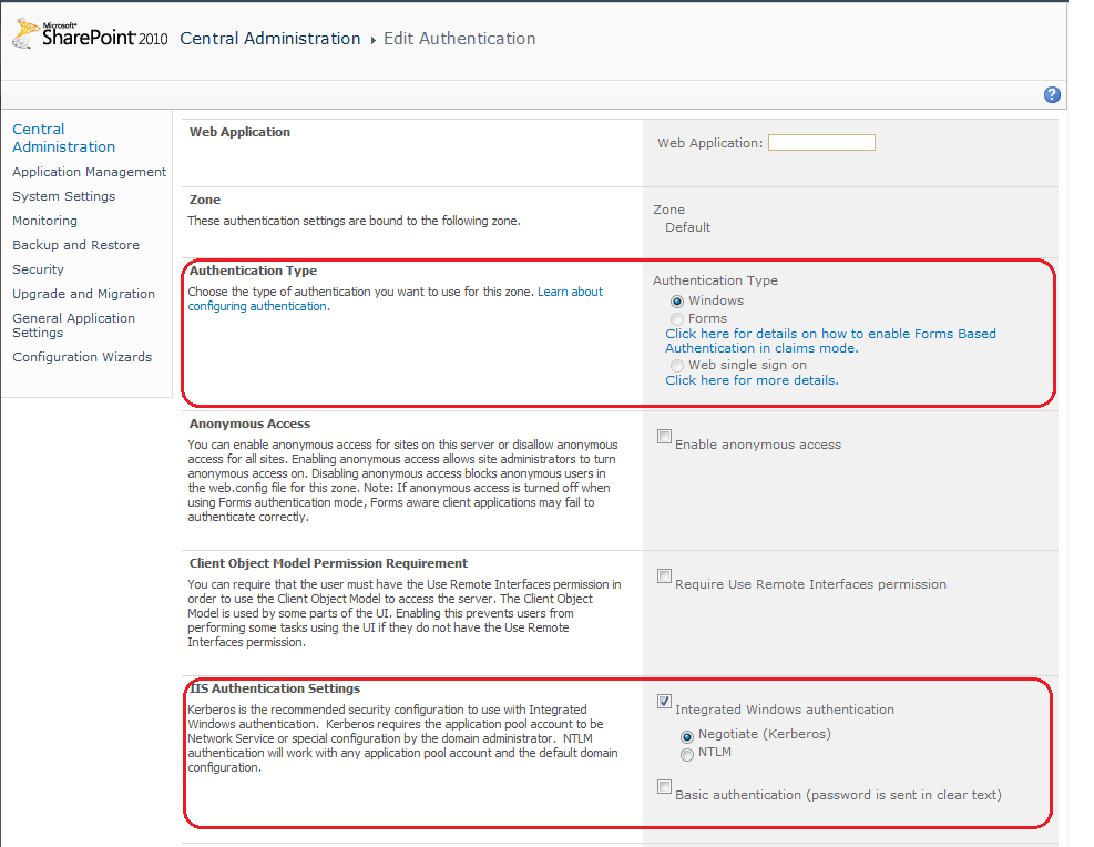 - Keep Authentication Type > Windows selected for web application (default for Microsoft SharePoint).