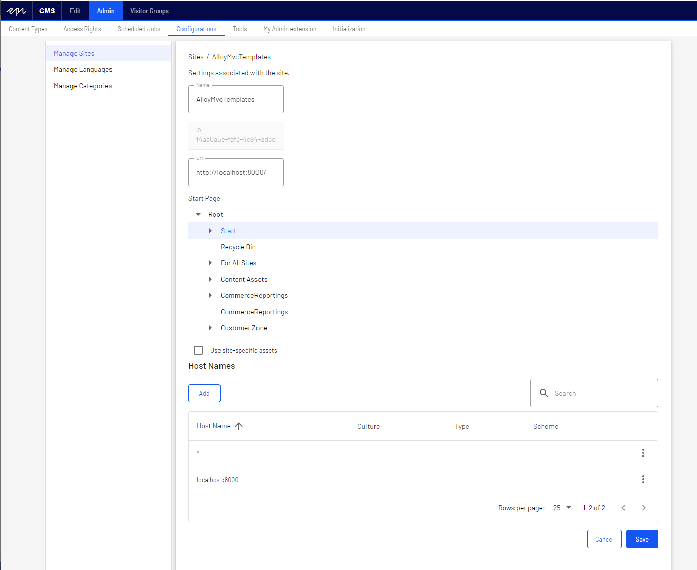 The start page is often a specific page type with unique properties, but any page type can be configured as start page. You configure the start page in the CMS admin view under Configuration > Manage Sites, by selecting a page in the page tree. The SiteUrl, StartPage, and host mapping settings are stored in the database.
