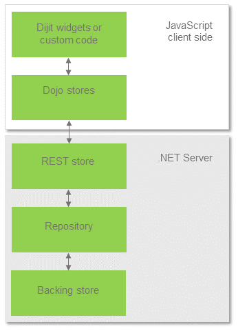 The creation of user interface elements is based on JavaScript and the Dojo toolkit. When the application starts up, a user interface definition is retreived from a REST store on the web server, and then instantiated on the client.
