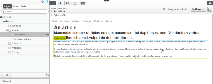 Example: A simple article page type with a "MainBody" editor area of the property type XhtmlString type, inheriting from the SitePageData base class.