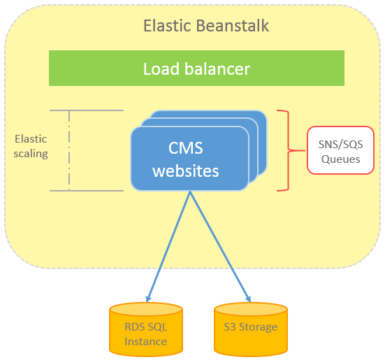 The following image illustrates a CMS website running in an Elastic beanstalk environment with multiple instances. The website instances share the same Amazon RDS (Relational Database Service) SQL instance, and the S3 storage in Amazon that stores binary file data in the cloud environment. The sites are load-balanced, and the SNS (Simple Notification Service)/SQS (Simple Queue Service) message queues manage events between the CMS websites.