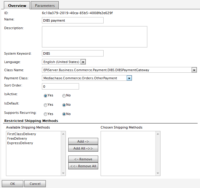 - Class Name. EPiServer.Business.Commerce.Payment.DIBS.DIBSPaymentGateway