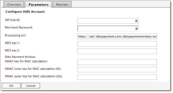 - In the payment provider list, click on DIBS payment, and click the Parameters tab, and set the parameters for DIBS. The API UserId and Merchant Password are the login/password for the administration page of DIBS. You need only the API UserId to let customers view, but to complete and return an order, you also must add a valid Merchant Password.