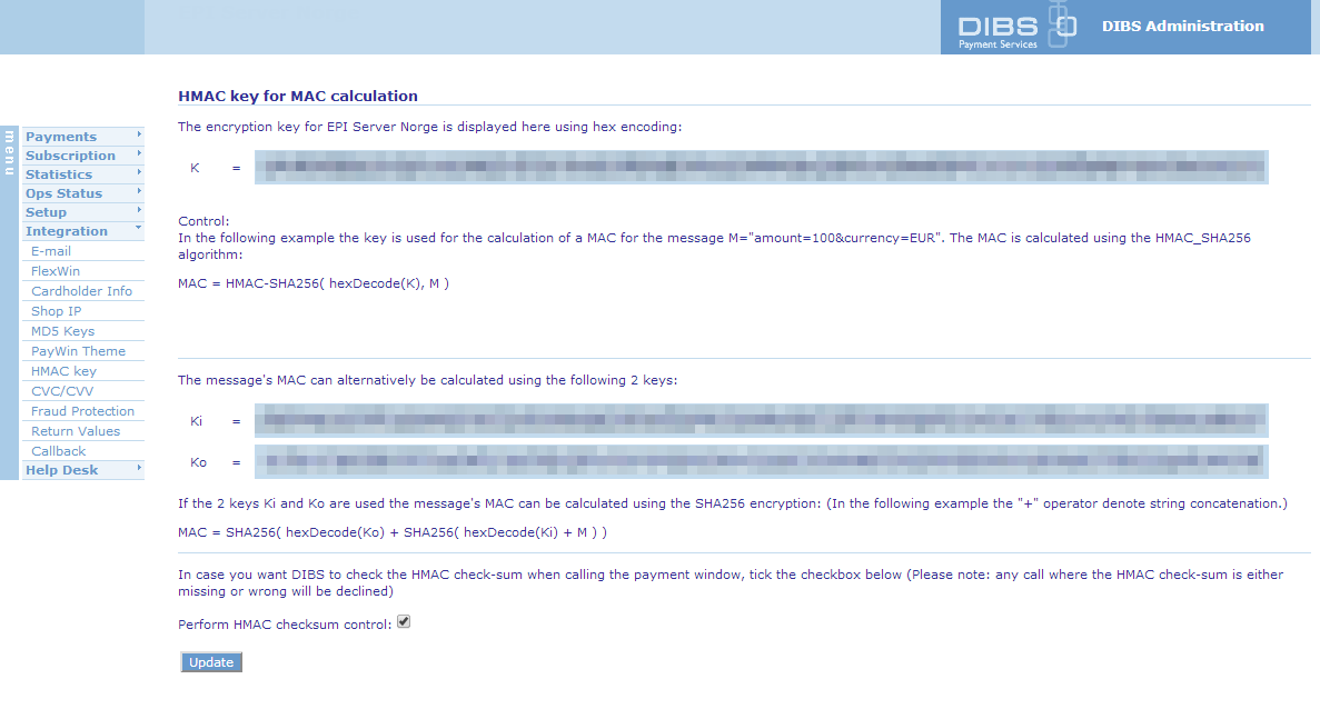 The HMAC values are available from the DIBS Administration interface: