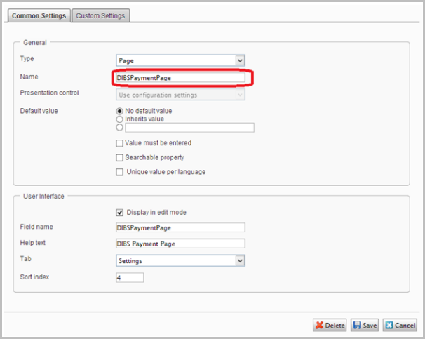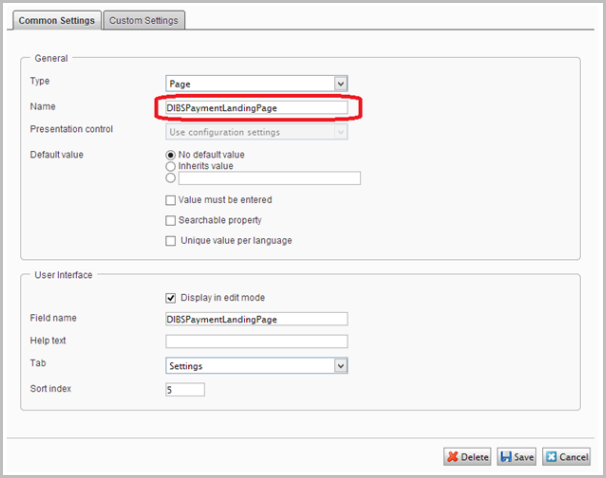 - Add two new properties of the type page to the website Home Page as shown in the following image. The name of the property must be DIBSPaymentPage and DIBSPaymentLandingPage. In this example the property is added to the Settings tab of the Home page.