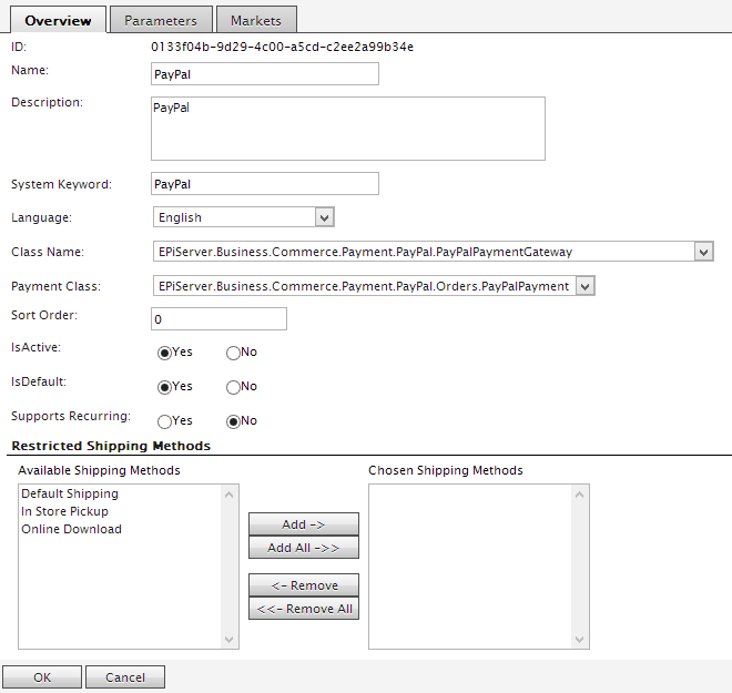 - Select Create new payment method. The System keyword must be PayPal (the name of the folder created during deployment). Class Name must be EPiServer.Business.Commerce.Payment.PayPal.PayPalPaymentGateway, and Payment Class must be EPiServer.Business.Commerce.Payment.PayPal.Orders.PayPalPayment.