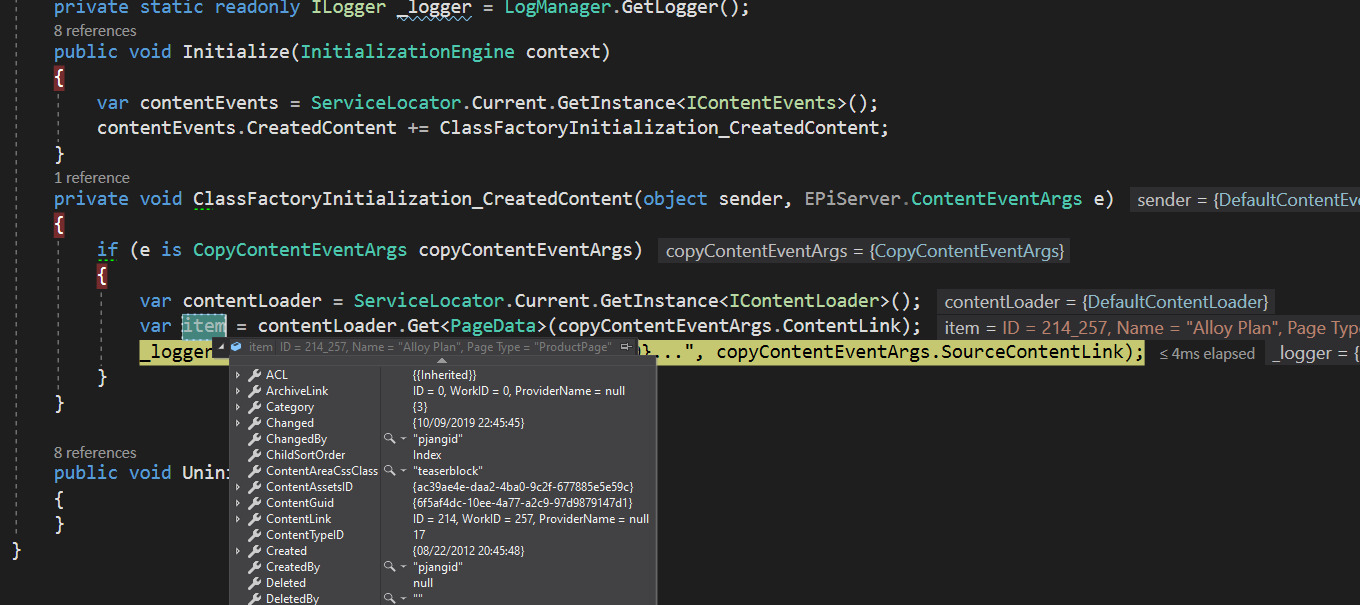 So, it hits multiple times in ClassFactoryInitialization_ContentCreated method. You need to hit until you get into if condition. Is that not going into if statement for you when you paste your copied page?