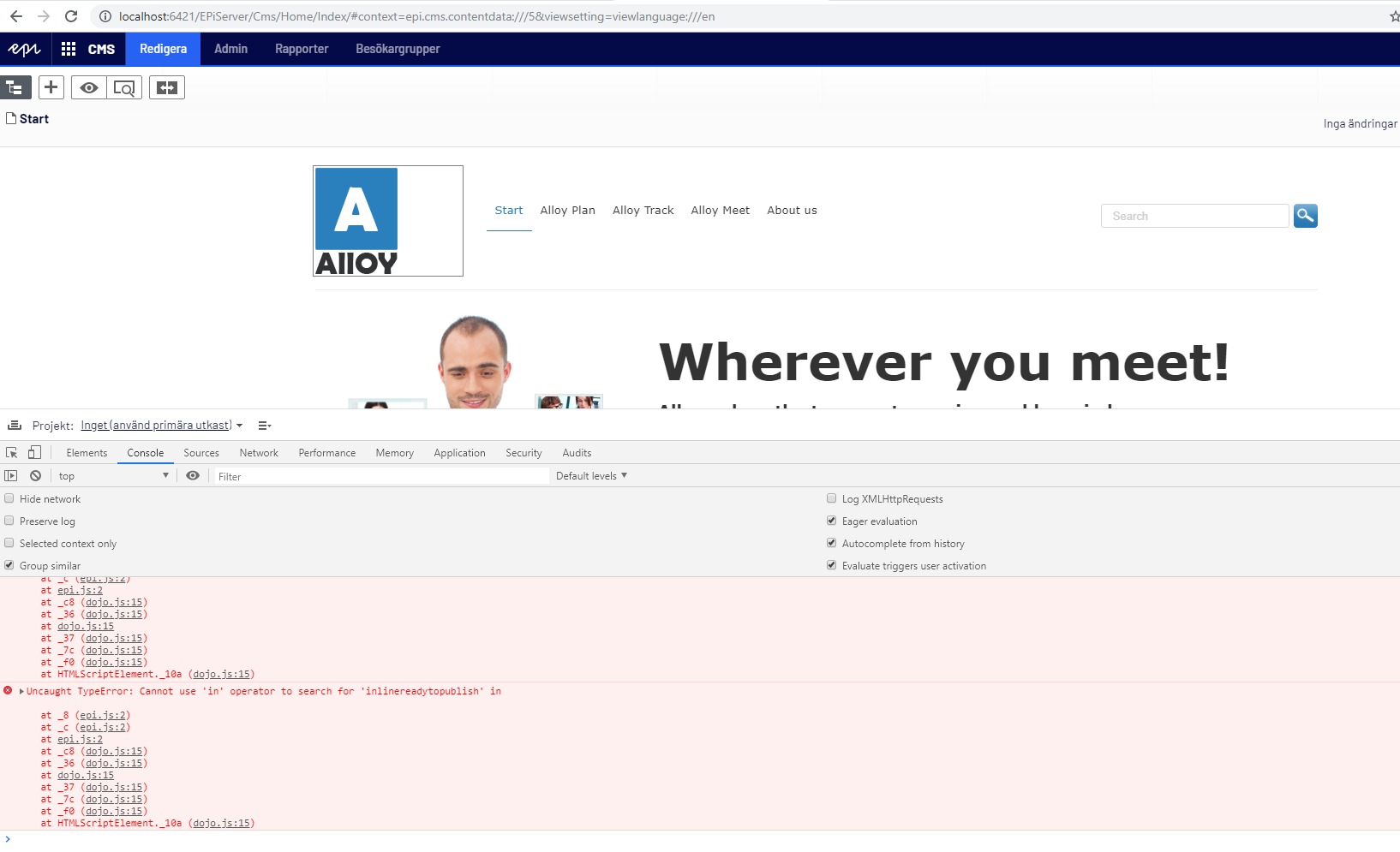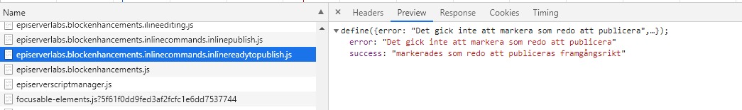 epi.js:2 Uncaught TypeError: Cannot use 'in' operator to search for 'inlinereadytopublish' inat _8 (epi.js:2)at _c (epi.js:2)at epi.js:2at _c8 (dojo.js:15)at _36 (dojo.js:15)at dojo.js:15at _37 (dojo.js:15)at _7c (dojo.js:15)at _f0 (dojo.js:15)at HTMLScriptElement._10a (dojo.js:15)We have tried to update to todays release of Cms UI but it did not help so we tried to remove the addon and then it worked.