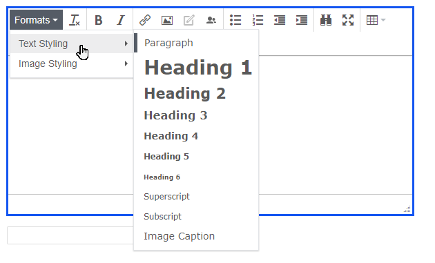 The issue am having is I can't even get the new style formats in the drop down. I am trying to add a new custom format to add to the dropdown where it shows following Paragraph=p;Heading 1=h1;Heading 2=h2;Heading 3=h3;Heading 4=h4;Heading 5=h5;Heading 6=h6;Blockquote=blockquote;Preformatted=pre"