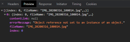 Either dragging and dropping or selecting the image file from the file system results in the same behaviour: the dialog closes without displaying any information to the user. The call to the http://RootUrl/ui/CMS/CMS/FileUpload/Upload/ URL returns a 200, which contains an error message(!)