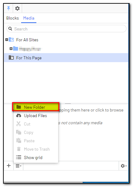 Creating a new folder and uploading images to the "For This Page/For This Block" section does fail. Uploading/creating folders in the "For This Site" folder works fine.