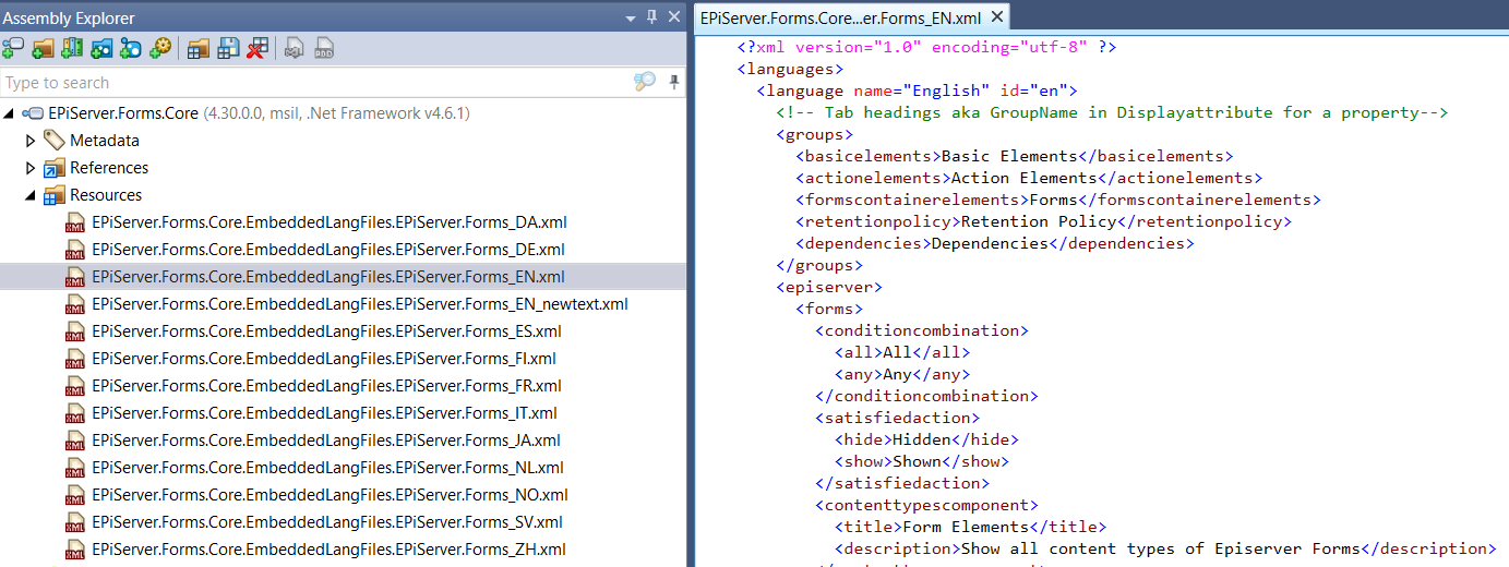 The message part inside the green circle is from the <episerver>\<forms>\<messages>\<formsubmission>\<submitcancelled> node of the Forms' embedded language resource file.