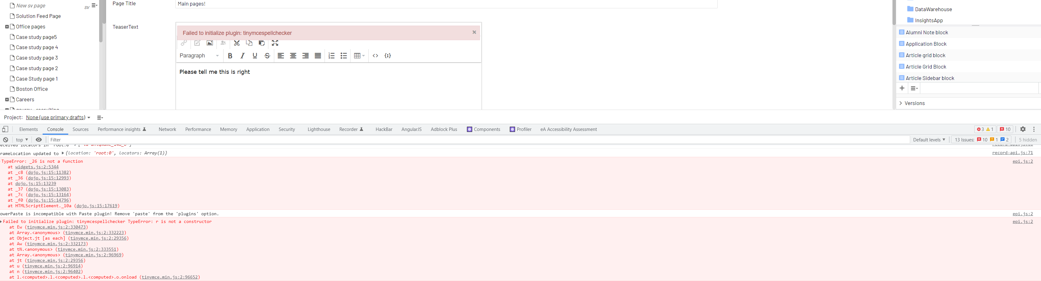 We are trying to add Tiny SpellChecker Pro plug-in to Episerver RTE through Tiny cloud. Tiny suggested invoking the below-mentioned script tag after the core TinyMce code is loaded in Episerver, but before the editor itself is initialized and rendered. Essentially, we need the TinyMCE global variable to be defined, which happens when TinyMCE's code loads. But the editor needs the Spellchecker Pro code to be loaded (in this case, via script tag) before it initializes and renders on the page.