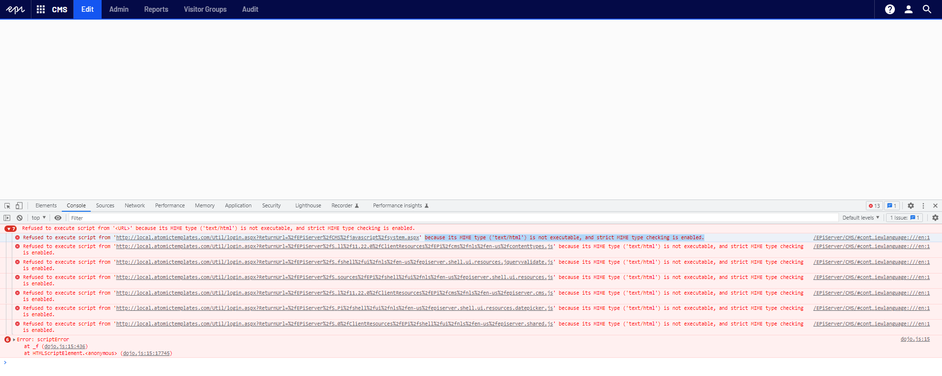 Sometime CMS Edit view is not loading with errors in console (see screenshot below). The issue is floating - sometimes it is not reproducing. Hard reload of a page usually helps, and Edit view become available. What may be a root of the issue?