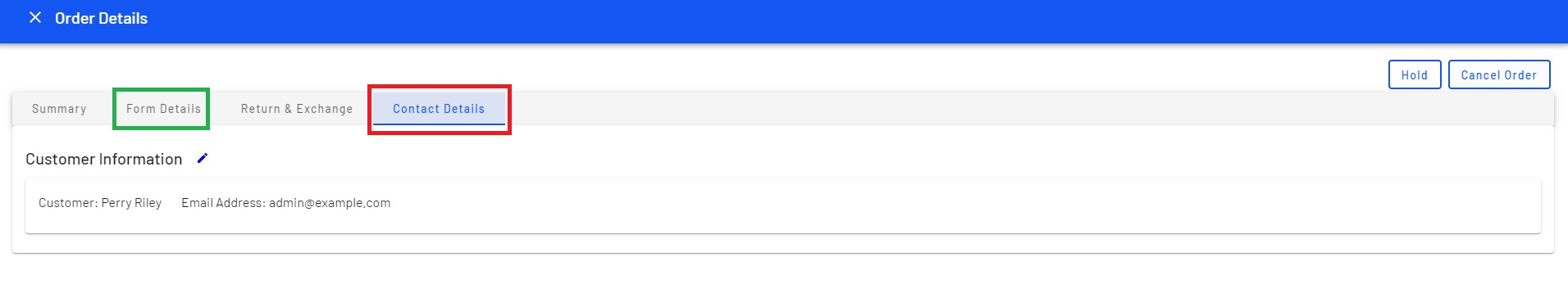 On the order details screen, there's a "Contact Details" tab which reflects the Customer Contact data stored on Episerver DB.