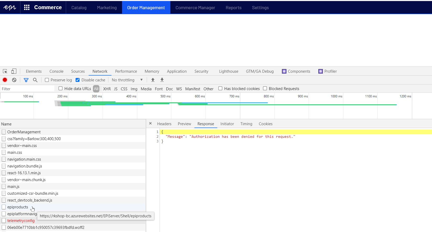 We have installed serviceapi on a commerce site. Everything works as expected with api queries, token, admin catalog, admin marketing. But the order management does not work, all xhr requests get :
