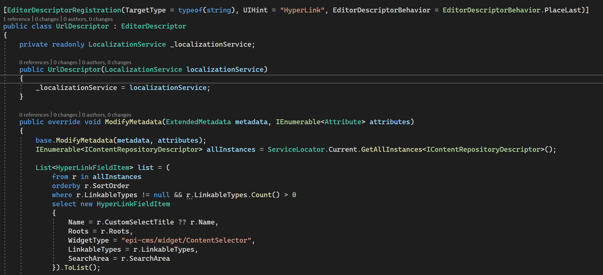 I need to extand UrlProperty (CMS 12) to be able choose also Block (ContentReference). It should be localized between Page and Media options. I need it to navigate to specific section (in this case block) on the page and editor can choose which block on his own. I know that I should use EditorDescriptor and modify metadata. But all solutions I've found in forum are involved only CMS11 end extending the HyperLinkProperty (https://world.optimizely.com/blogs/Anders-Hattestad/Dates/2015/2/extending-the-hyperlink-with-custom-field/) not Url. Maybe somebody's done something like this and can help me?