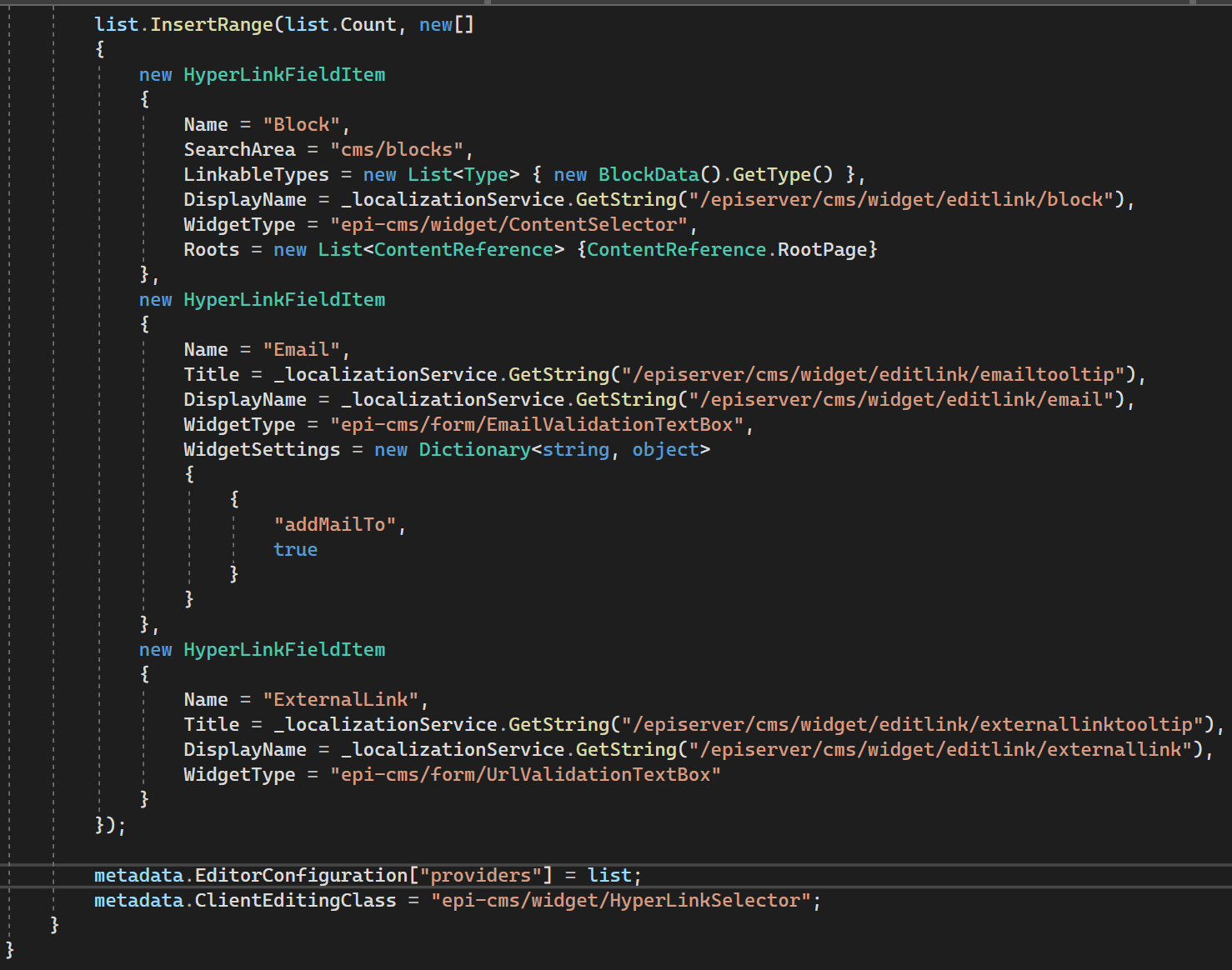 But the problem is: this code override all LinkItem/LinkItemCollection/Url properties (HyperLink is everything inside this Dialog). Is it possible to limit properties where I want to override links inside? I've tried to do it by UIHint but maybe in wrong way. Do you know how to do it?