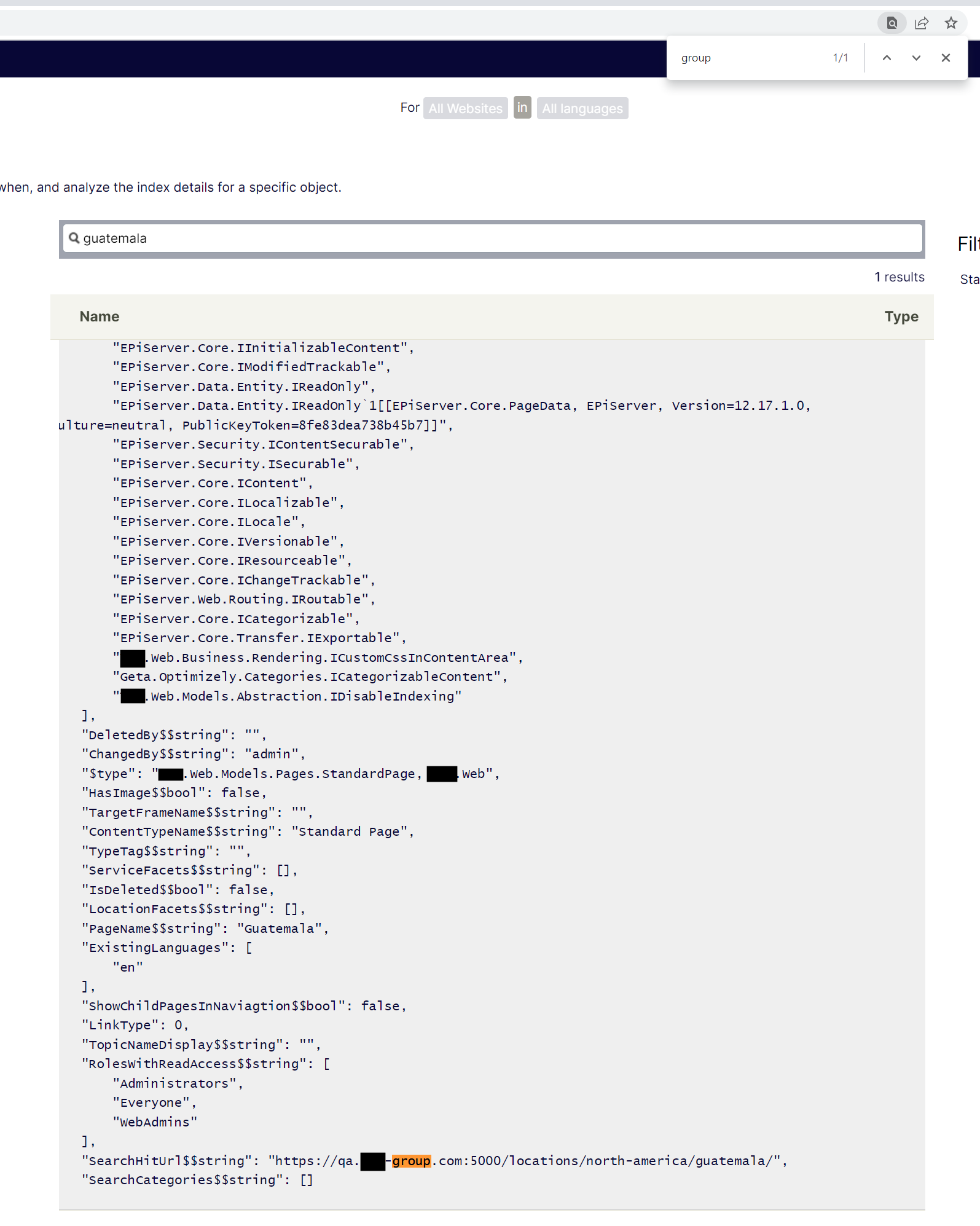 Could you look into the Find UI to see what is in the index of the content? In what field contains the "group" thing that you can spot?