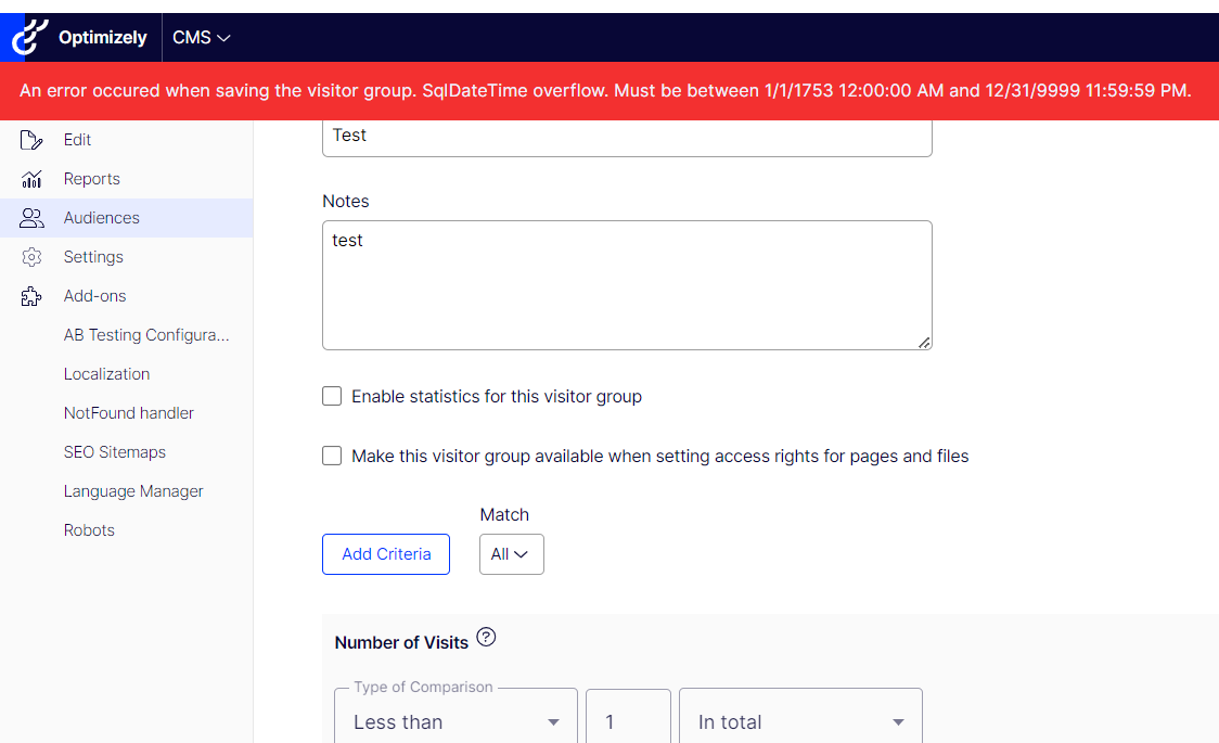 Now if, we create a Visitor Group criteria and getting SQLDateTime overflow.