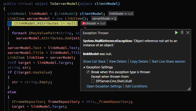 if (linkModel.Attributes != null) // <!!-- This is where it throws the System.NullReferenceException