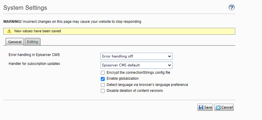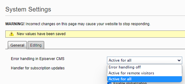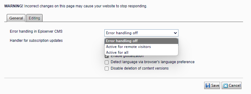 Set whether to use EPiServer CMS error handling with the following possible values: On, Off or RemoteOnly.